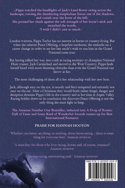 London waitress, Pippa Taylor has no interest in horses or country-living. But when she inherits Peace Offering, a hopeless racehorse, she embarks on a career change in order to see her late uncle's wish to run him in the Grand National come true. But having talked her way into a job as racing secretary to champion National Hunt trainer, Jack Carmichael and moved to the West Country, Pippa finds herself faced with more daunting obstacles than even the Grand National can throw at her. The most challenging of them all is her relationship with her new boss. Jack, although easy on the eye, is moody and fiery-tempered and certainly not easy on the ear. After a Christmas they would both rather forget, danger and deception threaten Pippa's life in the country and she discovers Peace Offering is not the only thing she must fight to keep. The Amazon Number One Bestseller, inducted into A Drop of Romeo Hall of Fame and Some Kind of Wonderful Awards runner-up for Best International Romance.