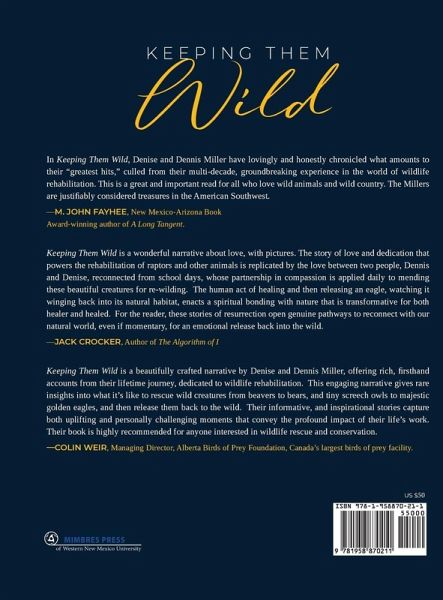 Keeping Them Wild documents real life accounts of the Miller's close-up and personal experiences with the thousands of animals they have cared for in Southwestern New Mexico over forty-five years at Gila Wildlife Rescue. Stunning photographs bring life to the remarkable stories of these courageous animals as they are nurtured back to nature. Denise and Dennis Miller describe their encounters with detailed background information to educate the reader about the wildlife in their care as well as human's role in the ecosystem and how to find ecological morality.