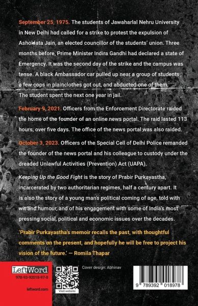 'A timely memoir from an Indian journalist under siege.' - N. Ram 'Prabir Purkayastha's memoir recalls the past, with thoughtful omments on the present, and hopefully he will be free to project his vision of the future.' - Romila Thapar September 25, 1975. The students of Jawaharlal Nehru University in New Delhi had called for a strike to protest the expulsion of Ashoklata Jain, an elected councillor of the students' union. Three months before, Prime Minister Indira Gandhi had declared a state of Emergency. It was the second day of the strike and the campus was tense. A black Ambassador car pulled up near a group of students, a few cops in plainclothes got out, and abducted one of them. The student spent the next one year in jail. February 9, 2021. Officers from the Enforcement Directorate raided the home of the founder of an online news portal. The raid lasted 113 hours, over five days. The office of the news portal was also raided. October 3, 2023. Officers of the Special Cell of Delhi Police remanded the founder of the news portal and his colleague to custody under the dreaded Unlawful Activities (Prevention) Act (UAPA). Keeping Up the Good Fight is the story of Prabir Purkayastha, incarcerated by two authoritarian regimes, half a century apart. It is also the story of a young man's political coming of age, told with wit and humour, and of his engagement with some of India's most pressing social, political and economic issues over the decades.