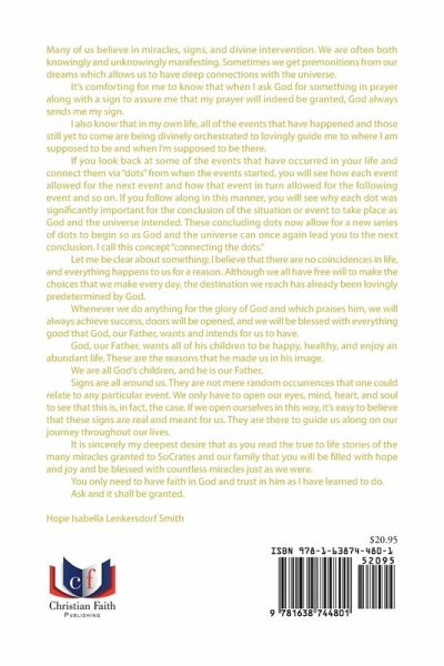 Many of us believe in miracles, signs, and divine intervention. We are often both knowingly and unknowingly manifesting. Sometimes we get premonitions from our dreams which allows us to have deep connections with the universe. It's comforting for me to know that when I ask God for something in prayer along with a sign to assure me that my prayer will indeed be granted, God always sends me my sign. I also know that in my own life, all of the events that have happened and those still yet to come are being divinely orchestrated to lovingly guide me to where I am supposed to be and when I'm supposed to be there. If you look back at some of the events that have occurred in your life and connect them via "dots" from when the events started, you will see how each event allowed for the next event and how that event in turn allowed for the following event and so on. If you follow along in this manner, you will see why each dot was significantly important for the conclusion of the situation or event to take place as God and the universe intended. These concluding dots now allow for a new series of dots to begin so as God and the universe can once again lead you to the next conclusion. I call this concept "connecting the dots." Let me be clear about something: I believe that there are no coincidences in life, and everything happens to us for a reason. Although we all have free will to make the choices that we make every day, the destination we reach has already been lovingly predetermined by God. Whenever we do anything for the glory of God and which praises him, we will always achieve success, doors will be opened, and we will be blessed with everything good that God, our Father, wants and intends for us to have. God, our Father, wants all of his children to be happy, healthy, and enjoy an abundant life. These are the reasons that he made us in his image. We are all God's children, and he is our Father. Signs are all around us. They are not mere random occurrences that one could relate to any particular event. We only have to open our eyes, mind, heart, and soul to see that this is, in fact, the case. If we open ourselves in this way, it's easy to believe that these signs are real and meant for us. They are there to guide us along on our journey throughout our lives. It is sincerely my deepest desire that as you read the true to life stories of the many miracles granted to SoCrates and our family that you will be filled with hope and joy and be blessed with countless miracles just as we were. You only need to have faith in God and trust in him as I have learned to do. Ask and it shall be granted. Hope Isabella Lenkersdorf Smith