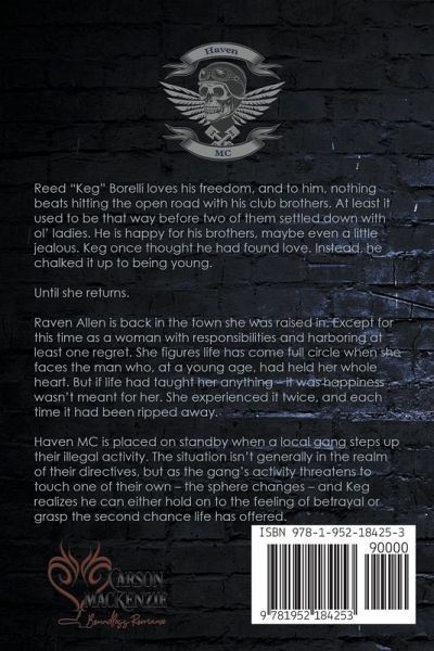 Reed "Keg" Borelli loves his freedom, and to him, nothing beats hitting the open road with his club brothers. At least it used to be that way before two of them settled down with ol' ladies. He is happy for his brothers, maybe even a little jealous. Keg once thought he had found love. Instead, he chalked it up to being young. Until she returns. Raven Allen is back in the town she was raised in. Except for this time as a woman with responsibilities and harboring at least one regret. She figures life has come full circle when she faces the man who, at a young age, had held her whole heart. But if life had taught her anything - it was happiness wasn't meant for her. She experienced it twice, and each time it had been ripped away. Haven MC is placed on standby when a local gang steps up their illegal activity. The situation isn't generally in the realm of their directives, but as the gang's activity threatens to touch one of their own - the sphere changes - and Keg realizes he can either hold on to the feeling of betrayal or grasp the second chance life has offered.