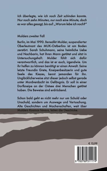 Ich überlegte, wie ich noch Zeit schinden konnte. Nur noch zehn Minuten, nur noch eine Minute, doch es war alles gesagt, bis auf: - Warum lebe ich noch? - Mulders zweiter Fall Berlin, im Mai 1990. Benedikt Mulder, suspendierter Oberleutnant des MUK-Ostberlins ist am Boden zerstört. Sarah Schuhmann, seine heimliche Liebe und Nachbarin, hat ihren Mann getötet und sitzt in Untersuchungshaft. Mulder fühlt sich dafür verantwortlich, und das ist er auch, irgendwie. Um ihr helfen zu können benötigt er einen Anwalt. Seine letzte Freundin Grete, Kneipenbesitzerin und gute Seele des Kiezes, kennt jemanden für ihn. Unglücklicherweise sitzt dieser jedoch selbst gerade unter Mordverdacht im Gefängnis. Er soll in einer Dorfkneipe an der Ostsee drei Menschen getötet haben. Die Beweise sind erdrückend. Schon bald geht es nicht mehr nur um Schuld oder Unschuld, sondern um Auswege und Vertuschung. Alte Geschichten und Machenschaften, weit über Mulders Kosmos hinaus, leiten die Geschicke.