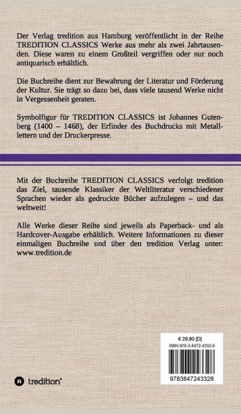 Diese Hardcover-Ausgabe ist Teil der TREDITION CLASSICS. Der Verlag tredition aus Hamburg veröffentlicht in der Buchreihe TREDITION CLASSICS Werke aus mehr als zwei Jahrtausenden. Diese waren zu einem Großteil vergriffen oder nur noch antiquarisch erhältlich. Mit TREDITION CLASSICS verfolgt tredition das Ziel, tausende Klassiker der Weltliteratur verschiedener Sprachen wieder als gedruckte Bücher zu verlegen und das weltweit! Die Buchreihe dient zur Bewahrung der Literatur und Förderung der Kultur. Sie trägt so dazu bei, dass viele tausend Werke nicht in Vergessenheit geraten.