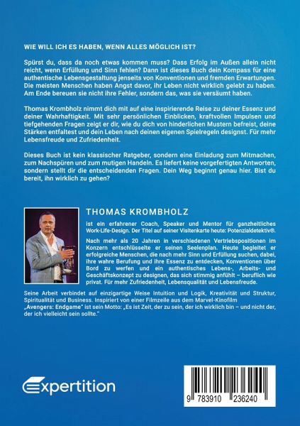 Thomas Krombholz - Potenzialdetektiv® & Experte für ganzheitliches Work-Life-DesignÜber den Autor:Thomas Krombholz ist Coach, Speaker und Mentor für Menschen, die sich nach einem erfüllten, authentischen Leben sehnen. Nach über 20 Jahren in verschiedenen Vertriebspositionen in der Konzernwelt erkannte er, dass er nicht länger nach äußeren Erwartungen leben wollte. Er entschlüsselte seinen eigenen Seelenplan und entdeckte seine wahre Berufung: Menschen dabei zu unterstützen, ihre Potenziale zu erkennen und ihr eigenes Lebens- und Arbeitsmodell zu gestalten - fernab von starren Konventionen.Seine Arbeit als Potenzialdetektiv® kombiniert Intuition und Logik, Kreativität und Struktur, Spiritualität und Business. Er hilft seinen Klienten, sich von gesellschaftlichen Zwängen zu lösen und ihre einzigartigen Talente selbstbewusst zu leben. Sein Motto, inspiriert aus Avengers: Endgame, lautet:"Es ist Zeit, der zu sein, der ich wirklich bin - und nicht der, der ich vielleicht sein sollte."Seine Mission:Mit seinem Wissen, seinen eigenen Erfahrungen und seinen einzigartigen Methoden begleitet er Menschen auf ihrem Weg zu einem selbstbestimmten, sinnerfüllten Leben. Er lädt dazu ein, mutig zu sein, echte Entscheidungen zu treffen und das Leben bewusst nach den eigenen Vorstellungen zu gestalten.Mehr über Thomas Krombholz: Website: thomas-krombholz.com