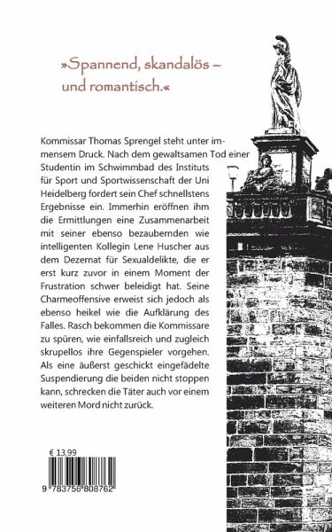 Kommissar Thomas Sprengel steht unter immensem Druck. Nach dem gewaltsamen Tod einer Studentin im Schwimmbad des Instituts für Sport und Sportwissenschaft der Uni Heidelberg fordert sein Chef schnellstens Ergebnisse ein. Immerhin eröffnen ihm die Ermittlungen eine Zusammenarbeit mit seiner ebenso bezaubernden wie intelligenten Kollegin Lene Huscher aus dem Dezernat für Sexualdelikte, die er erst kurz zuvor in einem Moment der Frustration schwer beleidigt hat. Seine Charmeoffensive erweist sich jedoch als ebenso heikel wie die Aufklärung des Falles. Rasch bekommen die Kommissare zu spüren, wie einfallsreich und zugleich skrupellos ihre Gegenspieler vorgehen. Als eine äußerst geschickt eingefädelte Suspendierung die beiden nicht stoppen kann, schrecken die Täter auch vor einem weiteren Mord nicht zurück.