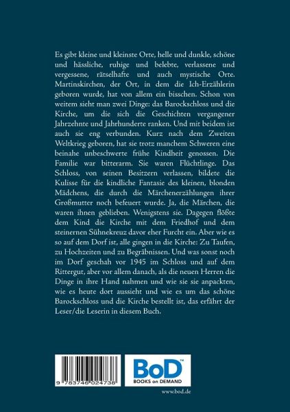 Es gibt kleine und kleinste Orte, helle und dunkle, schöne und hässliche, ruhige und belebte, verlassene und vergessene, rätselhafte und auch mystische Orte. Martinskirchen, der Ort, in dem die Ich-Erzählerin geboren wurde, hat von allem ein bisschen. Schon von weitem sieht man zwei Dinge: das Barockschloss und die Kirche, um die sich die Geschichten vergangener Jahrzehnte und Jahrhunderte ranken. Und mit beidem ist auch sie eng verbunden. Kurz nach dem Zweiten Weltkrieg geboren, hat sie trotz manchem Schweren eine beinahe unbeschwerte frühe Kindheit genossen. Die Familie war bitterarm. Sie waren Flüchtlinge. Das Schloss, von seinen Besitzern verlassen, bildete die Kulisse für die kindliche Fantasie des kleinen, blonden Mädchens, die durch die Märchenerzählungen ihrer Großmutter noch befeuert wurde. Ja, die Märchen, die waren ihnen geblieben. Wenigstens sie. Dagegen flößte dem Kind die Kirche mit dem Friedhof und dem steinernen Sühnekreuz davor eher Furcht ein. Aber wie es so aufdem Dorf ist, alle gingen in die Kirche: Zu Taufen, zu Hochzeiten und zu Begräbnissen. Und was sonst noch im Dorf geschah vor 1945 im Schloss und auf dem Rittergut, aber vor allem danach, als die neuen Herren die Dinge in ihre Hand nahmen und wie sie sie anpackten, wie es heute dort aussieht und wie es um das schöne Barockschloss und die Kirche bestellt ist, das erfährt der Leser/die Leserin in diesem Buch.
