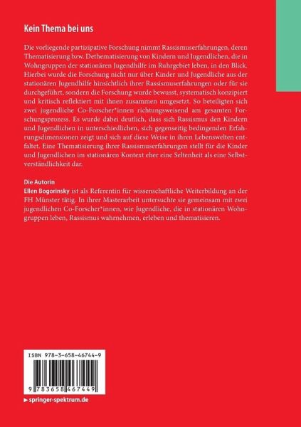 Die vorliegende partizipative Forschung nimmt Rassismuserfahrungen, deren Thematisierung bzw. Dethematisierung von Kindern und Jugendlichen, die in Wohngruppen der stationären Jugendhilfe im Ruhrgebiet leben, in den Blick. Hierbei wurde die Forschung nicht nur über Kinder und Jugendliche aus der stationären Jugendhilfe hinsichtlich ihrer Rassismuserfahrungen oder für sie durchgeführt, sondern die Forschung wurde bewusst, systematisch konzipiert und kritisch reflektiert mit ihnen zusammen umgesetzt. So beteiligten sich zwei jugendliche Co-Forscher_innen richtungsweisend am gesamten Forschungsprozess. Es wurde dabei deutlich, dass sich Rassismus den Kindern und Jugendlichen in unterschiedlichen, sich gegenseitig bedingenden Erfahrungsdimensionen zeigt und sich auf diese Weise in ihren Lebenswelten entfaltet. Eine Thematisierung ihrer Rassismuserfahrungen stellt für die Kinder und Jugendlichen im stationären Kontext eher eine Seltenheit als eine Selbstverständlichkeit dar.