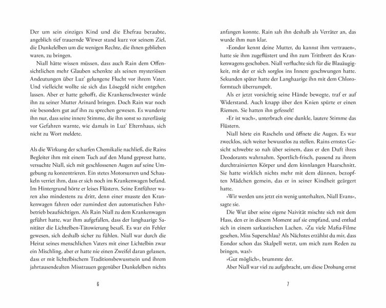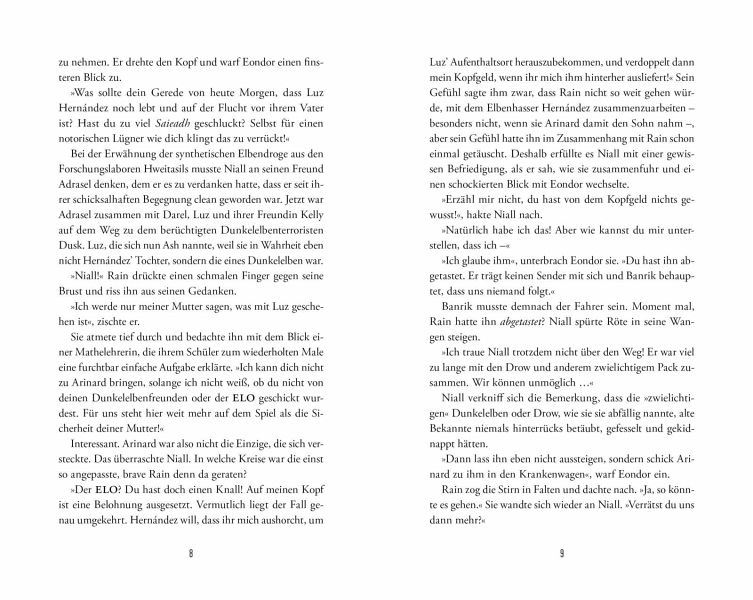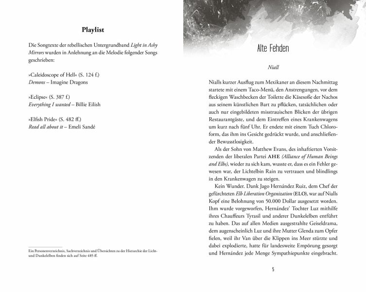 Wir finden uns in der komplexen Zukunftsversion aus dem Jahre 2044 wieder, in dem die Situation zwischen Licht-, Dunkelelben und Menschen immer angespannter wird. Die unterschiedlichen Gruppen verachten sich gegenseitig, verbreiten Gerüchte und verfolgen ohne Rücksicht auf die anderen ihre Pläne. Im ersten Teil musste ich mich noch sehr konzentrieren um alles zu verstehen, zu wissen, wer jetzt genau wer ist und wie das ganze System überhaupt funktioniert, im zweiten Teil war das jetzt etwas anders, sodass mir der Einstieg in das Buch sehr leichtgefallen ist. Die Welt ist weiterhin wirklich sehr komplex, aber wenn man sich einmal zurechtgefunden hat, entsteht dadurch nicht nur das Potenzial für eine Menge sehr unerwarteter Wendungen, sondern auch einige erschreckende Bezüge zur Realität.