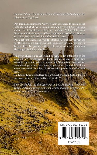 Ein unsichtbarer Feind, eine Frau mit Herz und die Schönheit der schottischen HighlandsDer dominant-sadistische Werwolf Alan ist sauer, da taucht seine Gefährtin auf, doch sie ist mit einem Spinner verlobt. Um sich von seinem Frust abzulenken, streift er in seiner Wolfsgestalt durch Glencoe, dabei sieht er sie. Ohne darüber nachzudenken, läuft er auf sie zu, bis ein Schuss ihn außer Gefecht setzt.Da sie erkennt, dass seine Wunde sofort heilt, beschließt er, sich ihr zu offenbaren. Jetzt fangen die Probleme erst richtig an. Abgesehen davon, dass ihn jemand töten will, muss er seine Traumfrau überzeugen, bei ihm zu bleiben.Bailey ist glücklich in Schottland zu sein, leider entpuppt sich ihr Verlobter als egozentrischer Idiot. Als er wieder einmal ihre Wünsche ignoriert, geht sie alleine auf Wandertour. Nur hat sie kaum damit gerechnet, dass ein vermeintlicher Hund sich in einen Mann verwandelt. Zu allem Überfluss behauptet er, ihr Gefährte zu sein.Ein Kampf Kopf gegen Herz beginnt.Darf sie ihrem Gefühl trauen oder wird sie nur erneut enttäuscht werden?Eine Geschichte, die den Leser mit in die schottischen Highlands nimmt, und zeigt, dass es sich lohnt, seinen Träumen zu folgen. Der Roman ist in sich abgeschlossen