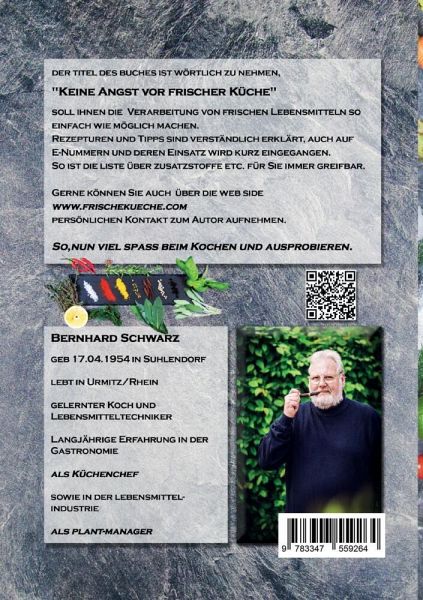 gelernter Koch und Lebensmitteltechnikermit Erfahrung in der mittleren Gastronomie, in den 80 er Jahren hat er für die Stars und Sternchen aus dem Musikladen und Musik aus Studio B gekocht.....Ebenso war Prinz Luis Ferdinand von Preußen des Öfteren als Gast.Das Buch hat er auf Wunsch vieler Freunde und Bekannte geschrieben.In der Lebensmittelindustrie war er im Pet Food Bereich der Fa Mars (Effem) im Bereich der Produktion als Bereichsleiter tätig.Bei einem großen Kartoffel Verarbeiter war er als Werksleiter tätig, und produzierte u.A. für McDonalds Pommes Frites.