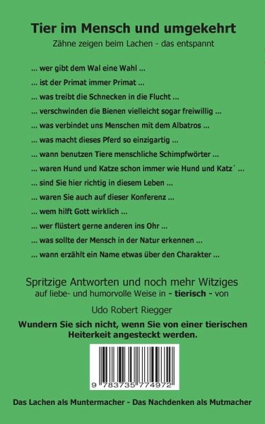 Tier im Mensch und umgekehrtentdecken Sie beider CharaktereZähne zeigen beim Lachen - das entspannt... wer gibt dem Wal eine Wahl ...... ist der Primat immer Primat ...... was treibt die Schnecken in die Flucht ...... verschwinden die Bienen vielleicht sogar freiwillig ...... was verbindet uns Menschen mit dem Albatros ...... was macht dieses Pferd so einzigartig ...... wann benutzen Tiere menschliche Schimpfwörter ...... waren Hund und Katze schon immer wie Hund und Katz´ ...... wer ist You Are Right ...... waren Sie auch auf dieser Konferenz ... ... wem hilft Gott wirklich ...... wer flüstert gerne anderen ins Ohr ...... was sollte der Mensch in der Natur erkennen ...... wann erzählt der Name etwas über den Charakter ... Spritzige Antworten und noch mehr Witziges auf liebe- und humorvolle Weise in - tierisch - von Udo Robert Riegger Wundern Sie sich nicht, wenn Sie von einer tierischen Heiterkeit angesteckt werden. Das Lachen als Muntermacher - Das Nachdenken als Mutmacher