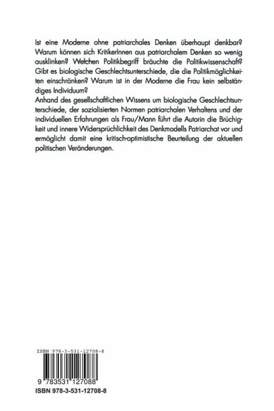 1. Die Analyse patriarchaler Denkstrukturen in einem politikwissenschaftlichen Rahmen.- 1.1 Zeitliche und räumliche Eingrenzung der Moderne.- 1.2 Voraussetzungen der Arbeit.- 1.3 Skizze des Argumentationsgangs.- 2. Paradigmen feministischer Politikwissenschaft.- 2.1 Spezielle Schwierigkeiten feministischer Ansätze zur Politikwissenschaft.- 2.2 Entwicklung und Merkmale der feministischen Politikwissenschaft.- 2.3 Ansätze neuer Paradigmen.- 3. Die ständige Neukonstruktion patriarchalen Denkens in der Moderne.- 3.1 Die Konzeption von Lebenswelt und System nach Jürgen Habermas.- 3.2 Frauen in der Theorie des kommunikativen Handelns.- 3.3 Die feministische Kritik an der Konzeption der Lebenswelt.- 3.4 Die ständige Neukonstruktion des lebensweltlich verankerten, patriarchalen Denkens in der Moderne.- 4. Vorstellungen über biologische Geschlechtsunterschiede.- 4.1 Die Wissenschaften von den natürlichen Geschlechtsunterschieden.- 4.2 Wissenschaftliche Ergebnisse über natürliche Geschlechtsunterschiede.- 4.3 'Natürliche' Geschlechtsunterschiede und die patriarchale Lebenswelt.- 5. Die dichotomen Ansprüche an Frauen und Männer.- 5.1 Das bürgerliche Frauenideal.- 5.2 Das autonome Individuum.- 5.3 Das 'andere' im modernen Denken.- 6. Die Erfahrung geschlechtsspezifischer Unterschiede.- 6.1 Fremd-, Selbst- und Ideal-Zuweisungen geschlechtsspezifischer Eigenschaften.- 6.2 Die Umsetzung moderner Ansprüche in konkrete Lebensformen.- 7. Die Sprache als patriarchales Deutungsmuster und als Kommunikationsmedium.- 7.1 Sprache als patriarchales Deutungsmuster.- 7.2 Verzerrungen unserer Wahrnehmung durch Sprache.- 7.3 Reflexionspotential statt Sprachoptimismus.- 8. Die Veränderbarkeit der Denkstruktur Patriarchat.- 8.1 Stabilität und Anpassungsfähigkeit derDenkstruktur Patriarchat als Hemmnis und Chance der Veränderung.- 8.2 Die Verankerung der feministischen Politikwissenschaft in patriarchalen Deutungsmustern.- Literatur.