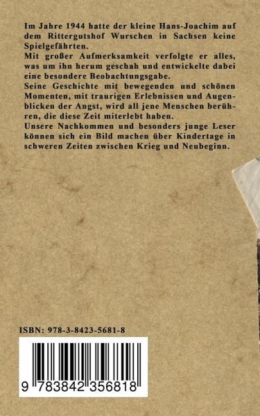 Im Jahre 1944 hatte der kleine Hans-Joachim auf dem Rittergutshof Wurschen in Sachsen keine Spielgefährten. Mit großer Aufmerksamkeit verfolgte er alles, was um ihn herum geschah und entwickelte dabei eine besondere Beobachtungsgabe.Seine Geschichte mit bewegenden und schönen Momenten, mit traurigen Erlebnissen und Augenblicken der Angst, wird all jene Menschen berühren, die diese Zeit miterlebt haben.Unsere Nachkommen und besonders junge Leser können sich ein Bild machen über Kindertage in schweren Zeiten zwischen Krieg und Neubeginn.