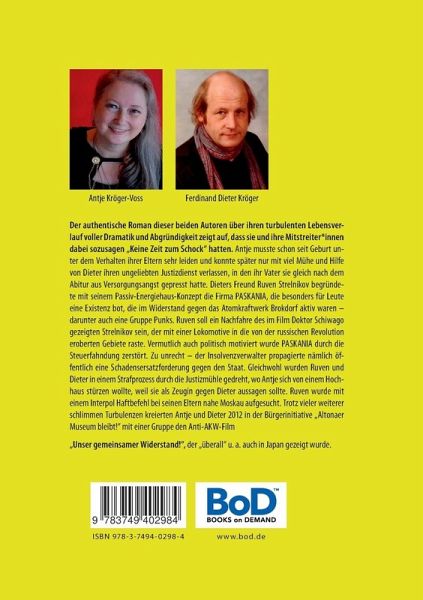 Der authentische Roman dieser beiden Autoren über ihren turbulenten Lebensverlauf voller Dramatik und Abgründigkeit zeigt auf, dass sie und ihre Mitstreiter_innen dabei sozusagen "Keine Zeit zum Schock" hatten. Antje musste schon seit Geburt unter dem Verhalten ihrer Eltern sehr leiden und konnte später nur mit viel Mühe und Hilfe von Dieter ihren ungeliebten Justizdienst verlassen, in den ihr Vater sie gleich nach dem Abitur aus Versorgungsangst gepresst hatte. Dieters Freund Ruven Strelnikov begründete mit seinem Passiv-Energiehaus-Konzept die Firma PASKANIA, die besonders für Leute eine Existenz bot, die im Widerstand gegen das Atomkraftwerk Brokdorf aktiv waren - darunter auch eine Gruppe Punks. Ruven soll ein Nachfahre des im Film Doktor Schiwago gezeigten Strelnikov sein, der mit einer Lokomotive in die von der russischen Revolution eroberten Gebiete raste. Vermutlich auch politisch motiviert wurde PASKANIA durch die Steuerfahndung zerstört. Zu unrecht - der Insolvenzverwalter propagierte nämlich öffentlich eine Schadensersatzforderung gegen den Staat. Gleichwohl wurden Ruven und Dieter in einem Strafprozess durch die Justizmühle gedreht, wo Antje sich von einem Hochhaus stürzen wollte, weil sie als Zeugin gegen Dieter aussagen sollte. Ruven wurde mit einem Interpol Haftbefehl bei seinen Eltern nahe Moskau aufgesucht. Trotz vieler weiterer schlimmen Turbulenzen kreierten Antje und Dieter 2012 in der Bürgerinitiative "Altonaer Museum bleibt!" mit einer Gruppe den Anti-AKW-Film "Unser gemeinsamer Widerstand!", der "überall" u.a. auch in Japan gezeigt wurde.