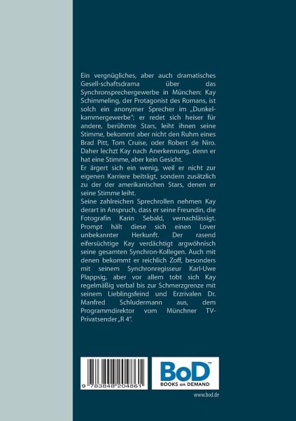 Ein vergnügliches, aber auch dramatisches Gesellschaftsdrama über das Synchronsprechergewerbe in München: Kay Schimmeling, der Protagonist des Romans, ist solch ein anonymer Sprecher im "Dunkelkammergewerbe"; er redet sich heiser für andere, berühmte Stars, leiht ihnen seine Stimme, bekommt aber nicht den Ruhm eines Brad Pitt, Tom Cruise, oder Robert de Niro. Daher lechzt Kay nach Anerkennung, denn er hat eine Stimme, aber kein Gesicht. Er ärgert sich ein wenig, weil er nicht zur eigenen Karriere beiträgt, sondern zusätzlich zu der der amerikanischen Stars, denen er seine Stimme leiht. Seine zahlreichen Sprechrollen nehmen Kay derart in Anspruch, dass er seine Freundin, die Fotografin Karin Sebald, vernachlässigt. Prompt hält diese sich einen Lover unbekannter Herkunft. Der rasend eifersüchtige Kay verdächtigt argwöhnisch seine gesamten Synchron-Kollegen. Auch mit denen bekommt er reichlich Zoff, besonders mit seinem Synchronregisseur Karl-Uwe Plappsig, aber vor allem tobt sich Kay regelmäßig verbal bis zur Schmerzgrenze mit seinem Lieblingsfeind und Erzrivalen Dr. Manfred Schludermann aus, dem Programmdirektor vom Münchner TV-Privatsender "R 4". Zwischen den beiden fliegen stets aufs Neue die Fetzen, aber für Kay ist das routinemäßige, gegenseitige Beleidigungsprogramm jedes Mal gleichbedeutend mit einer Verjüngungskur; die beiden Kontrahenten brauchen einfach die tägliche Erniedrigungs-Redeschlammschlacht, um sich abzureagieren von ihren Sorgen. Völlig ausgebrannt und psychisch am Boden, will er sich am Starnberger See von den Strapazen der Synchronisiererei und von Karins "Verrat" erholen, und macht dort beinahe die größte Dummheit seines Lebens. Wieder zu Hause in München, lernt Kay einen reichen Gönner und Freund kennen, einen Unternehmer, der sein Glück wird: Kay wird wohlhabend und märchenhaft reich, denn mit Ludwig Bodenstedts Hilfe ist er praktisch selber zum reichen Unternehmer geworden. Doch bald droht neues Unglück: Kay gerät zusehends in den Dunstkreis von Bodenstedts verführerischer Frau Miranda und deren teuflischer Schwester Bianca. Kay verkraftet die neuen Herausforderungen dieser Dreier-Konstellation nicht und wird zum schweren Alkoholiker. Mit Karin Sebalds Hilfe fängt er sich einigermaßen wieder, doch dann geschieht ein neues, unfassbares, furchtbares Unglück ... Unfall? Mord? Selbstmord? Die Polizei tappt im Dunkeln. Wie wird der gute Kay diesen neuen Schicksalsschlag verkraften?Wird er sich je wieder erholen?