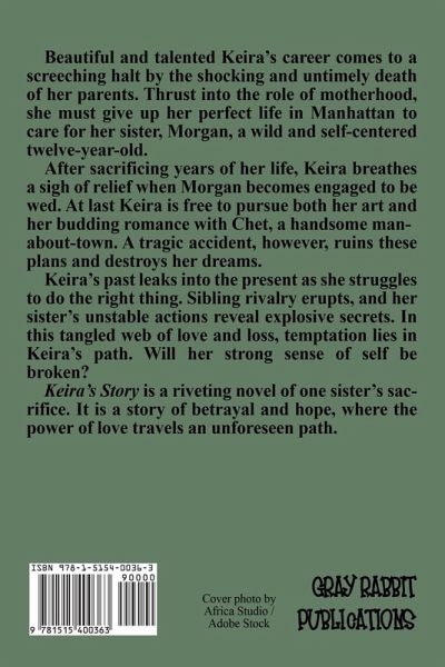 Beautiful and talented Keira's career comes to a screeching halt by the shocking and untimely death of her parents. Thrust into the role of motherhood, she must give up her perfect life in Manhattan to care for her sister, Morgan, a wild and self-centered twelve-year-old. After sacrificing years of her life, Keira breathes a sigh of relief when Morgan becomes engaged to be wed. At last Keira is free to pursue both her art and her budding romance with Chet, a handsome man-about-town. A tragic accident, however, ruins these plans and destroys her dreams. Keira's past leaks into the present as she struggles to do the right thing. Sibling rivalry erupts, and her sister's unstable actions reveal explosive secrets. In this tangled web of love and loss, temptation lies in Keira's path. Will her strong sense of self be broken? Keira's Story is a riveting novel of one sister's sacrifice. It is a story of betrayal and hope, where the power of love travels an unforeseen path.