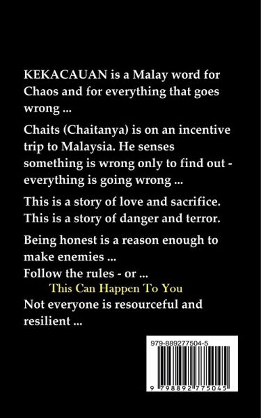 KEKACAUAN is a Malay word for Topsy-Turvy, Chaos and for everthing that is going wrong... Chaits (Chaitanya) is on an incentive trip to Malaysia. He senses something is wrong only to find out - everything's going wrong in his life... This is a story of love and sacrifice. This is a story of danger and terror. Being honest is a reason enough to make enemies... Follow the rules - or This Can Happen To You. Not everyone is resourceful and resilient...