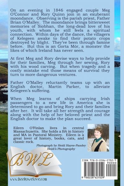 On an evening in 1846 engaged couple Meg O'Connor and Rory Quinn join in an exuberant moondance. Observing is the parish priest, Father Brian O'Malley. The moondance brings bittersweet memories of Siobhan, the long-dead love of his youth, with whom he still feels a spiritual connection. Within days of the dance, the villagers of Kelegeen awake to find their potato crops destroyed by blight. They've been through famine before. But this is an Gorta Mór, a monster the likes of which Ireland has never seen. At first Meg and Rory devise ways to help provide for their families, Meg through her sewing, Rory with his wood carving. But when tragedy and a costly mistake end those means of survival they turn to more dangerous ventures. Father O'Malley reluctantly teams up with an English doctor, Martin Parker, to alleviate Kelegeen's suffering. When Meg learns of ships carrying Irish passengers to a new life in America she is determined to go and bring Rory and their families after her. It will take all her strength and courage along with the help of her beloved priest and the English doctor to make the plan succeed.