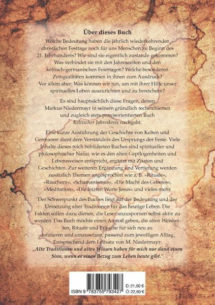 Welche Bedeutung haben die jährlich wiederkehrenden christlichen Festtage noch für uns Menschen zu Beginn des 21. Jahrhunderts? Wie sind sie eigentlich zustande gekommen? Was verbindet sie mit den Jahreszeiten und den keltisch-germanischen Feiertagen? Welche besonderen Zeitqualitäten kommen in ihnen zum Ausdruck? Vor allem aber: Was können wir tun, um mit ihrer Hilfe unser spirituelles Leben auszurichten und zu bereichern? Es sind hauptsächlich diese Fragen, denen Markus Niedermayr in seinem gründlich recherchierten und zugleich stets praxisorientierten Buch Keltischer Jahreskreis nachgeht. Eine kurze Ausführung der Geschichte von Kelten und Germanen dient dem Verständnis des Ursprungs der Feste. Viele Inhalte dieses reich bebilderten Buches sind spiritueller und philosophischer Natur, wie es den alten Gepflogenheiten und Lebensweisen entsprach, ergänzt mit Zitaten und Geschichten. Zur weiteren Ergänzung und Vertiefung werden zusätzlich Themen angesprochen wie z. B. »Rituale«, »Räuchern«, »Schamanismus«, »Die Macht des Gebetes«, »Meditation«, »Die letzten Worte Jesus« und vieles mehr. Der Schwerpunkt des Buches liegt auf der Bedeutung und der Umsetzung alter Traditionen für das heutige Leben. Die Fakten sollen dazu dienen, die Leser anzuspornen selbst aktiv zu werden. Das Buch möchte einen Anstoß geben, die alten Weisheiten, Rituale und Bräuche für sich neu zu definieren und umzusetzen, passend zum jeweiligen Alltag.Entsprechend dem Leitsatz von M. Niedermayr: "Alte Traditionen und altes Wissen haben für mich nur dann einen Sinn, wenn es einen Bezug zum Leben heute gibt."