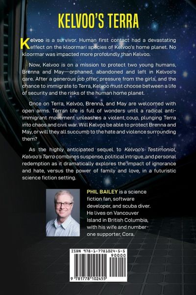 Kelvoo is a survivor. Human first contact had a devastating effect on the kloormari species of Kelvoo's home planet. No kloormar was impacted more profoundly than Kelvoo. Now, Kelvoo is on a mission to protect two young humans, Brenna and May-orphaned, abandoned, and left in Kelvoo's care. After a generous job offer, pressure from the girls, and the chance to immigrate to Terra, Kelvoo must choose between a life of security and the risks of the human homeworld. Once on Terra, Kelvoo, Brenna, and May are welcomed with open arms. Terran life is full of wonders until a radical anti-immigrant movement unleashes a violent coup, plunging Terra into chaos and civil war. Will Kelvoo be able to protect Brenna and May, or will they all succumb to the hate and violence surrounding them? -- As the highly anticipated sequel to Kelvoo's Testimonial, Kelvoo's Terra combines suspense, political intrigue, and personal redemption as it dramatically explores the impact of ignorance and hate, versus the power of family and love, in a futuristic science fiction setting.