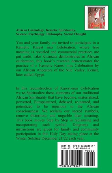 You, your family and community are invited to participate in a Kemetic Karest mas Celebration, where true meaning is revealed and commercial practices are put aside. Like Kwanzaa demonstrates an African celebration, this book s research demonstrates the practice of a Kemetic Karest mas Celebration by our African Ancestors of the Nile Valley, Kemet, later called Egypt. In this reconstruction of Karest mas Celebration we re-Spiritualize those elements of our traditional African Spirituality that have become, materialized, perverted, Europeanized, debased, re-named, and potentized to be injurious to the African consciousness. We reclaim our sacred symbols, remove distortions and ungarble their meaning. This book moves Step by Step in reclaiming and incorporating each symbol. Diagrams and instructions are given for family and community participation in this Holy Day taking place at the Winter Solstice December 21/22 each year.