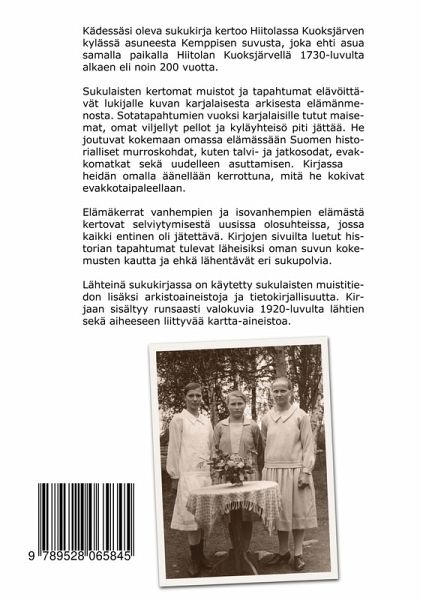 Kädessäsi oleva sukukirja kertoo Hiitolassa Kuoksjärven kylässä asuneesta Kemppisen suvusta, joka ehti asua samalla paikalla Hiitolan Kuoksjärvellä 1730-luvulta alkaen eli noin 200 vuotta. Sukulaisten kertomat muistot ja tapahtumat elävöittävät lukijalle kuvan karjalaisesta arkisesta elämänmenosta. Sotatapahtumien vuoksi karjalaisille tutut maisemat, omat viljellyt pellot ja kyläyhteisö piti jättää. He joutuvat kokemaan omassa elämässään Suomen historialliset murroskohdat, kuten talvi- ja jatkosodat, evakkomatkat sekä uudelleen asuttamisen. Kirjassa heidän omalla äänellään kerrottuna, mitä he kokivat evakkotaipaleellaan. Elämäkerrat vanhempien ja isovanhempien elämästä kertovat selviytymisestä uusissa olosuhteissa, jossa kaikki entinen oli jätettävä. Kirjojen sivuilta luetut historian tapahtumat tulevat läheisiksi oman suvun kokemusten kautta ja ehkä lähentävät eri sukupolvia. Lähteinä sukukirjassa on käytetty sukulaisten muistitiedon lisäksi arkistoaineistoja ja tietokirjallisuutta. Kirjaan sisältyy runsaasti valokuvia 1920-luvulta lähtien sekä aiheeseen liittyvää kartta-aineistoa.