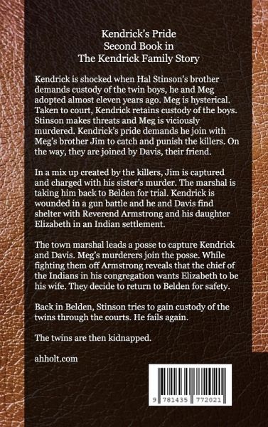 Kendrick is shocked when Hal Stinson's brother demands custody of the twin boys, he and Meg adopted almost eleven years ago. Meg is hysterical. Taken to court, Kendrick retains custody of the boys. Stinson makes threats and Meg is viciously murdered. Kendrick's pride demands he join with Meg's brother Jim to catch and punish the killers. On the way, they are joined by Davis, their friend. In a mix up created by the killers, Jim is captured and charged with his sister's murder. The marshal is taking him back to Belden for trial. Kendrick is wounded in a gun battle and he and Davis find shelter with Reverend Armstrong and his daughter Elizabeth in an Indian settlement. The town marshal leads a posse to capture Kendrick and Davis. Meg's murderers join the posse. While fighting them off Armstrong reveals that the chief of the Indians in his congregation wants Elizabeth to be his wife. They decide to return to Belden for safety. Back in Belden, Stinson tries to gain custody of the twins through the courts. He fails again. The twins are then kidnapped.