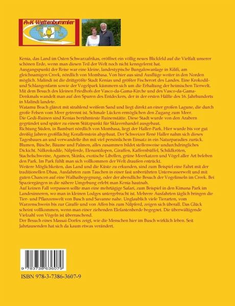 Kenia, das Land im Osten Schwarzafrikas, eröffnet ein völlig neues Blickfeld auf die Vielfalt unserer schönen Erde, wenn man diesen Teil der Welt noch nicht kennengelernt hat. Ausgangspunkt der Reise war eine kleine, landestypische Bungalowanlage in Kilifi, am gleichnamigen Creek, nördlich von Mombasa. Von hier aus sind Ausflüge weiter in den Norden möglich. Malindi ist die drittgrößte Stadt Kenias und größter Fischerort des Landes. Eine Krokodil- und Schlangenfarm sowie der Vogelpark kümmern sich um die Erhaltung der heimischen Tierwelt. Watamu Beach glänzt mit strahlend weißem Sand und liegt direkt an einer großen Lagune, die durch große Felsen vom Meer getrennt ist. Schmale Lücken ermöglichen den Zugang zum Meer. Die Gedi-Ruinen sind Kenias berühmteste Ruinenstätte. Diese Stadt wurde von den Arabern gegründet und später zu einem Stützpunkt für Sklavenhandel ausgebaut. Richtung Süden, in Bamburi nördlich von Mombasa, liegt der Haller-Park. Hier wurde bis vor gut dreißig Jahren großflächig Korallenstein abgebaut. Der Schweizer René Haller nahm sich dieses Tagesbaues an und verwandelte ihn mit viel persönlichem Einsatz in ein Naturparadies zurück. Blumen, Büsche, Bäume und Palmen, alles zusammen bildet stellenweise undurchdringliches Dickicht. Viele verschiedene Tierarten sowie Vögel aller Art beleben den Park. Im Park fühlt man sich vollkommen der Welt draußen entrückt.Weitere Möglichkeiten, das Land und die Küste zu erkunden, sind zum Beispiel eine Fahrt mit der traditionellen Dhau, Ausfahrten zum Tauchen in einer fast unberührten Unterwasserwelt und mit guten Chancen auf eine Walhaibegegnung, oder der abendliche Besuch der Vogelinseln im Creek. Bei Spaziergängen in die nähere Umgebung erlebt man Kenia hautnah. Auf keinen Fall verpassen sollte man eine mehrtägige Safari, zum Beispiel in den Kimana Park im Landesinneren, wo man in kleinen Lodges untergebracht ist. Mehrere Ausfahrten täglich bringen die Tier- und Pflanzenwelt von Busch und Savanne nahe. Unglaublich viele Tierarten, vom Warzenschwein bis zur Giraffe und von Affen bis zum Nilpferd, zeigen sich überall. Das Glück scheint vollkommen, wenn man einer ziehenden Elefantenherde begegnet. Die überwältigende Vielzahl von Vögeln ist überraschend. Der Besuch eines Massai-Dorfes zeigt, wie die Menschen hier im Busch wirklich leben. Seit Jahrtausenden hat sich da kaum etwas verändert.