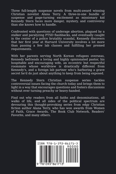 Three full-length suspense novels from multi-award winning Christian novelist Alana Terry. A three-in-one bundle of suspense and page-turning excitement as missionary kid Kennedy Stern faces more danger, mystery, and controversy than she knows how to handle. Confronted with questions of underage abortion, plagued by a stalker and paralyzing PTSD flashbacks, and eventually caught in the center of a police brutality scandal, Kennedy discovers that her first year at Harvard University involves a lot more than passing a few lab classes and fulfilling her premed requirements. With her parents serving North Korean refugees overseas, Kennedy befriends a loving and highly opinionated pastor, his hospitable and encouraging wife, an eccentric but respectful roommate whose worldview is drastically different from Kennedy's, and a foreign lab partner who's harboring a grave secret he'd do just about anything to keep from being exposed. The Kennedy Stern Christian suspense series tackles controversial issues facing the church today and brings them to light in a way that encourages questions and fosters discussions without ever turning preachy or heavy-handed. Find out why readers from all faiths and denominations, all walks of life, and all sides of the political spectrum are devouring this thought-provoking series from edgy Christian fiction author Alana Terry, who has won awards from Women of Faith, Grace Awards, The Book Club Network, Readers' Favorite, and many others.