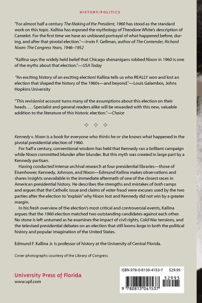 "For almost half a century The Making of the President, 1960 has stood as the standard work on this topic. Kallina has exposed the mythology of Theodore White's description of Camelot. For the first time we have an unbiased portrayal of what happened before, during, and after that pivotal election."--Irving F. Gellman, author of The Contender: Richard Nixon, the Congress Years, 1946-1952 "Readers will never look at the historic 1960 election the same way again."--Matthew Corrigan, author of Race, Religion, and Economic Change in the Republican South Kennedy v. Nixon is a book for everyone who thinks they know what happened in the pivotal election year of 1960. For fifty years we've accepted Theodore White's premise (from The Making of the President, 1960) that Kennedy ran a brilliant campaign while Nixon committed blunder after blunder. But White the journalist was a Kennedy partisan and helped establish the myth of Camelot. Now, five decades later, Edmund Kallina offers a fresh overview of the election's most critical and controversial events. Based upon research conducted at four presidential libraries--those of Eisenhower, Kennedy, Johnson, and Nixon--Kallina is able to make observations and share insights unavailable in the immediate aftermath of one of the closest races in American presidential history. He describes the strengths and mistakes of both camps, and examines the impact of civil rights, Cold War tensions, and the televised presidential debates on an election that still looms large in both the political history and the popular imagination of the United States.