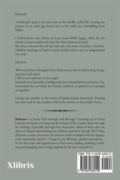 Kennedy A little girl's prayer becomes lost in the shuffle called life. Losing my parents at an early age forced me to live with my controlling Aunt Millie. I forfeited my own desires to keep Aunt Millie happy. After all, my mother's sister would only have her best interests at heart But those interests forced me into my own form of prison a loveless, childless marriage to Pastor Lamar Jordan who is just as judgemental my aunt. Quentin Who would have thought that a blind mercy date would end up bringing your soul mate? I fell in love with her at first sight. Kennedy was beautiful, intelligent funny and ambitious and mine. Unfortunately her one fault, her loyalty, ended us as quickly as it brought us together Losing one another in the name of family loyalty destroyed...Finding our way back to one another will be the answer to Kennedy's Prayer.