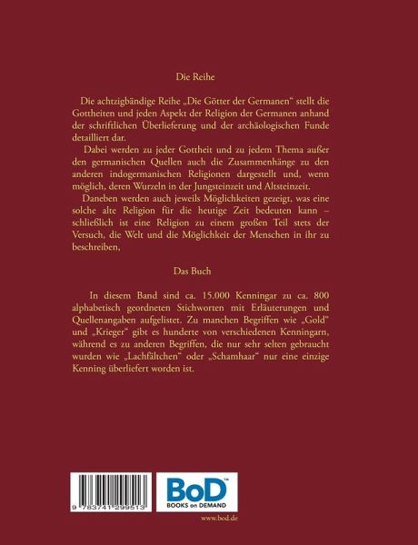 Die ReiheDie achtzigbändige Reihe "Die Götter der Germanen" stellt die Gottheiten und jeden Aspekt der Religion der Germanen anhand der schriftlichen Überlieferung und der archäologischen Funde detailliert dar.Dabei werden zu jeder Gottheit und zu jedem Thema außer den germanischen Quellen auch die Zusammenhänge zu den anderen indogermanischen Religionen dargestellt und, wenn möglich, deren Wurzeln in der Jungsteinzeit und Altsteinzeit.Daneben werden auch jeweils Möglichkeiten gezeigt, was eine solche alte Religion für die heutige Zeit bedeuten kann - schließlich ist eine Religion zu einem großen Teil stets der Versuch, die Welt und die Möglichkeit der Menschen in ihr zu beschreiben,Das BuchIn diesem Band sind ca. 15.000 Kenningar zu ca. 800 alphabetisch geordneten Stichworten mit Erläuterungen und Quellenangaben aufgelistet.Zu manchen Begriffen wie "Gold" und "Krieger" gibt es hunderte von verschiedenen Kenningarn, während es zu anderen begriffen, die nur sehr selten gebraucht wurden wie "Lachfältchen" oder "Schamhaar" nur eine einzige Kenning überliefert worden ist.