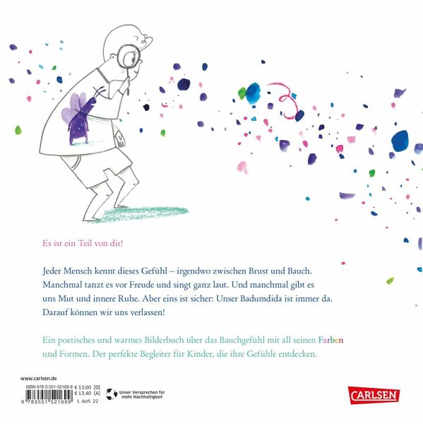 Jeder Mensch kennt dieses Gefühl - irgendwo zwischen Brust und Bauch. Manchmal tanzt es vor Freude und singt ganz laut. Und manchmal gibt es uns Mut und innere Ruhe. Aber eins ist sicher: Unser Badumdida ist immer da. Darauf können wir uns verlassen! Ein poetisches und warmes Bilderbuch über das Bauchgefühl. Spielerisch und einfühlsam lernen Kindern ihre Gefühle zu benennen. So können sie Selbstvertrauen fassen und sich selbst kennenlernen.