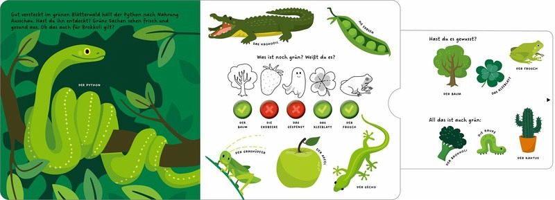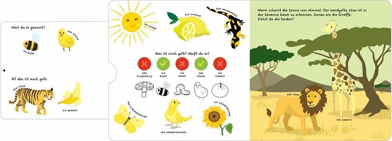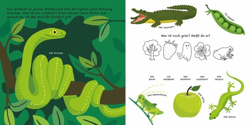 Farben sind überall - doch welche ist deine Lieblingsfarbe? Himmelblau oder Schokoladenbraun? Finde es heraus und lerne die Welt der Farben kennen. Weißt du, welche Farbe ein Gecko hat? Oder ein Gespenst? Dieses Buch bringt Farben zum Leben und weckt die Neugier. Mit Schiebern und Rätseln macht das Lernen Freude und fördert das Entdecken.