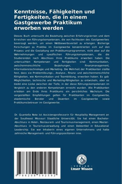 Dieses Buch untersucht die Beziehung zwischen Erfahrungslernen und dem Erreichen von Führungskompetenzen, die von Fachleuten des Gastgewerbes bevorzugt werden, um einen Wettbewerbsvorteil zu erlangen. Bisherige Forschungen zu Praktika im Gastgewerbe konzentrierten sich auf den Prozess und die Gestaltung von Praktikumsprogrammen, nicht aber auf die Wahrnehmungen und spezifischen Führungskompetenzen, die die Studierenden nach Abschluss ihres Praktikums erworben haben. Die untersuchten Kompetenzen und Fertigkeiten sind: Kommunikation, zwischenmenschliche Beziehungen, Finanzmanagement, Informationstechnologie und Marketing. Die Mehrheit der Praktikanten stellte fest, dass sie Problemlösungs-, Analyse-, Finanz- und zwischenmenschliche Fähigkeiten, wie Kommunikation und Teambildung, erworben haben. Es gab Möglichkeiten, technische und Marketing-Fähigkeiten zu entwickeln, aber es bleibt eine Lücke zwischen der Tiefe, in der diese Führungskompetenzen im Vergleich zu den anderen Kompetenzen erreicht wurden. Alle Praktikanten erlebten am Ende ihres Praktikums ein persönliches Wachstum. Die vorgestellten Empfehlungen gelten für Praktikanten im Gastgewerbe, akademische Berater und Dozenten im Gastgewerbe sowie Praktikumsbetreuer im Gastgewerbe.