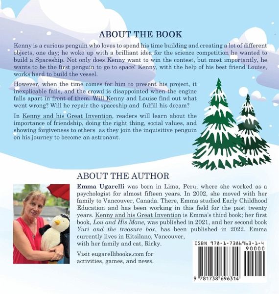 Kenny is a curious penguin who loves to spend his time building and creating a lot of different objects, one day he woke up with a brilliant idea for the science competition he wanted to build a Spaceship. Not only does Kenny want to win the contest, but most importantly, he wants to be the first penguin to go to space! Kenny, with the help of his best friend Louise, works hard on building the vessel. However, when the time comes for him to present his project, it inexplicable fails, and the crowd is disappointed when the engine falls apart in front of them. Will Kenny and Louise find out what went wrong? Will he repair the spaceship and fulfill his dream? In Kenny and his Great Invention, readers will learn about the importance of friendship, doing the right thing, social values, and showing forgiveness to others as they join the inquisitive penguin on his journey to become an astronaut.