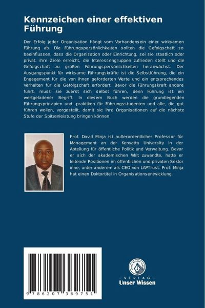 Der Erfolg jeder Organisation hängt vom Vorhandensein einer wirksamen Führung ab. Die Führungspersönlichkeiten sollten die Gefolgschaft so beeinflussen, dass die Organisation oder Einrichtung, sei sie staatlich oder privat, ihre Ziele erreicht, die Interessengruppen zufrieden stellt und die Gefolgschaft zu großen Führungspersönlichkeiten heranwächst. Der Ausgangspunkt für wirksame Führungskräfte ist die Selbstführung, die ein Engagement für die von ihnen geforderten Werte und ein entsprechendes Verhalten für die Gefolgschaft erfordert. Bevor die Führungskraft andere führt, muss sie zuerst sich selbst führen, denn Führung ist ein wertgeladener Begriff. In diesem Buch werden die grundlegenden Führungsprinzipien und -praktiken für Führungsstudenten und alle, die gut führen wollen, vorgestellt, damit sie ihre Organisationen auf die nächste Stufe der Spitzenleistung bringen können.