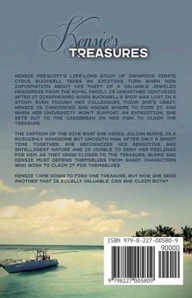 Kensie Prescott's life-long study of infamous pirate Cyrus Buckwell takes an exciting turn when new information about his theft of a valuable jeweled headdress from the Royal Family is unearthed centuries after it disappeared when Buckwell's ship was lost in a storm. Even though her colleagues think she's crazy, Kensie is convinced she knows where to find it, and when her university won't support an expedition, she sets out to the Caribbean on her own to claim the treasure. The captain of the dive boat she hires, Julian Burke, is a roguishly handsome but uncouth man. After only a short time together, she recognizes his sensitive and intelligent nature and is unable to deny her feelings for him. As they draw closer to the treasure, Burke and Kensie must defend themselves from shady characters who wish to claim it for themselves. Kensie came down to find one treasure, but now she sees another that is equally valuable. Can she claim both?