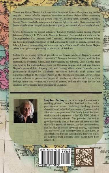 Kent to Kefalonia is the second volume of LucyAnn Curling's series Curling Wisps & Whispers of History. In Volume 1, Thanet to Tasmania, fortune did not smile on the Curling family in Van Diemen's Land (Tasmania). At the beginning of Volume 2 they are back in England, struggling to find a financial foothold in society. Second son, Edward, has an unrewarding job in an attorney's office, when Charles James Napier offers him a golden opportunity on the island of Kefalonia. Follow the surprising twists of providence as Edward works on Napier's unusual project. What is the Malta connection? Tensions between Napier and his line manager, Sir Frederick Adam, have repercussions for Edward. Greece at this time was fighting for independence from the Ottoman empire and that war touches Napier's personal life obliquely but with lasting effect, while Edward's too is permanently changed by a different encounter. Edward's work journal and numerous letters in the Napier Papers at the British and Bodleian Libraries bear witness to the social pressures acting on all members of this extended clan, as their feelings come into conflict with accepted norms, and set the stage for further dramatic developments soon to appear in Volume 3.