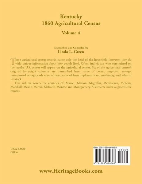 This census names only the head of the household. Often times when an individual was missed on the regular U.S. Census, he would appear on this agricultural census. So you might try checking this census for your missing relatives. Unfortunately, many of the Agricultural Census records have not survived. But they do yield unique information about how people lived. There are 48 columns of information, six of which are transcribed here: name of the owner, improved acreage, unimproved acreage, cash value of the farm, value of farm implements and machinery, and value of livestock. This volume covers Mason, Marion, Magoffin, McCracken, McLean, Marshall, Meade, Mercer, Metcalfe, Monroe and Montgomery counties.