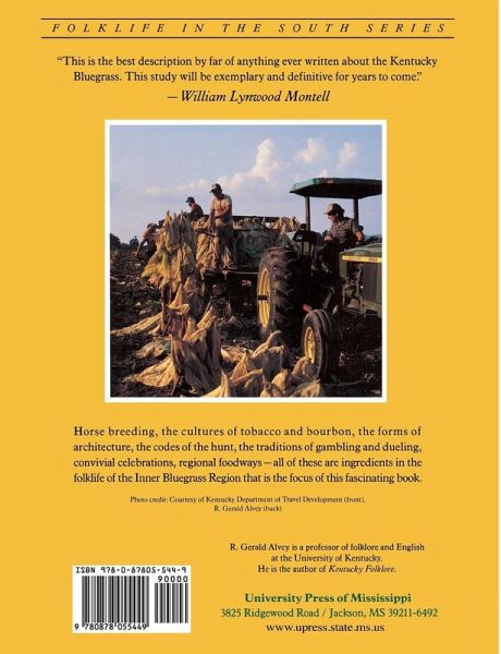 Kentucky Bluegrass Country by R. Gerald Alvey Horse breeding, the cultures of tobacco and bourbon, the forms of architecture, the codes of the hunt, the traditions of gambling and dueling, convivial celebrations, regional foodways-all of these are ingredients in the folklife of the Inner Bluegrass Region that is the focus of this fascinating book. R. Gerald Alvey (retired) was a professor of folklore and English at the University of Kentucky.