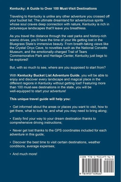 Exploring Kentucky: A Guide to over 100 Must-See Destinations in Kentucky to Hit the Road & Start Your Adventure Today Traveling to Kentucky is unlike any other adventure you crossed off your bucket list. The ultimate dreamland for adventurous spirits whose soul craves deep connection with nature, Kentucky is rich in picturesque landscapes that'll leave you breathless. As you travel the distance through the vast parks and history-rich scenic drives, you'll have the time of your life getting lost in the Bluegrass State's immersive beauty. From breath-taking views like the Crystal Onyx Cave, to novelties such as the National Corvette Museum, and the emotionally-charged Trail of Tears Commemorative Park and Heritage Center, Kentucky just begs to be explored! But, with so much to see, where are you supposed to start from? With Kentucky Bucket List Adventure Guide, you will be able to enjoy and discover every landscape and magical place in the different regions in Kentucky without getting lost! Featuring more than 100 must-see destinations in the state, you will be well-equipped to start your adventure! This unique travel guide will help you: Get informed about the areas or places you want to visit, how to get there, what to look for, and what you may need to bring along; Easily find your way to your dream destination thanks to comprehensive driving instructions; Never get lost thanks to the GPS coordinates included for each adventure in this guide; Discover the best time to visit certain destinations, weather conditions, average expenses; And much more! Grab a copy of this guide and you're well set to explore Kentucky! Every chapter comes with lesser-known facts about all the amazing 100+ Kentucky destinations featured in this blueprint that'll make you fall in love with this wonderful state even more. Do you dare break your daily routine and go on an adventure of a lifetime? Scroll up, click on "Buy Now with 1-click", and Get Your Copy Now! ¿