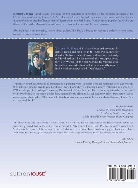 Kentucky Horse Park: Paradise Found is the first complete book written on the #1 horse sanctuary in the United States-Kentucky Horse Park. Ms. Howard takes you behind the scenes as you meet and discover the dozens of unique breeds of horses that call Kentucky Horse Park home. From the most popular, the Arabian, to the rarest breed, the Marwari, you will discover where and when each breed originated. Also included is an invaluable, superb photo gallery. This book is bound to become a collector's item passed from generation to generation.