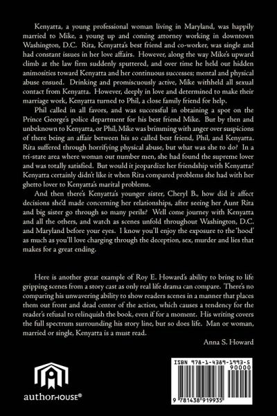 Kenyatta, a young professional woman living in Maryland, was happily married to Mike, a young up and coming attorney working in downtown Washington, D.C. Rita, Kenyatta's best friend and co-worker, was single and had constant issues in her love affairs. However, along the way Mike's upward climb at the law firm suddenly sputtered, and over time he held out hidden animosities toward Kenyatta and her continuous successes; mental and physical abuse ensued. Drinking and promiscuously active, Mike withheld all sexual contact from Kenyatta. However, deeply in love and determined to make their marriage work, Kenyatta turned to Phil, a close family friend for help. Phil called in all favors, and was successful in obtaining a spot on Prince George's police department for his best friend Mike. But by then and unbeknown to Kenyatta, or Phil, Mike was brimming with anger over suspicions of there being an affair between his so called best friend, Phil, and Kenyatta. Rita suffered through horrifying physical abuse, but what was she to do? In a tri-state area where women out number men, she had found the supreme lover and was totally satisfied. But would it jeopardize her friendship with Kenyatta? Kenyatta certainly didn't like it when Rita compared problems she had with her ghetto lover to Kenyatta's marital problems. And then there's Kenyatta's younger sister, Cheryl B., how did it affect decisions she'd made concerning her relationships after seeing her Aunt Rita and big sister go through so many perils? Well come journey with Kenyatta and all the others, and watch as scenes unfold throughout Washington, D.C. and Maryland before your eyes. I know you'll enjoy the exposure to the 'hood' as much as you'll love charging through the deception, sex, murder and lies that makes for a great ending