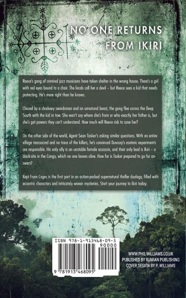 No one returns from Ikiri. Reece's gang of criminal jazz musicians have taken shelter in the wrong house. There's a girl with red eyes bound to a chair. The locals call her a devil - but Reece sees a kid that needs protecting. He's more right than he knows. Chased by a shadowy swordsman and an unnatural beast, the gang flee across the Deep South with the kid in tow. She won't say where she's from or who exactly her scary father is, but she's got powers they can't understand. How much will Reece risk to save her? On the other side of the world, Agent Sean Tasker's asking similar questions. With an entire village massacred and no trace of the killers, he's convinced Duvcorp's esoteric experiments are responsible. His only ally is an unstable female assassin, and their only lead is Ikiri - a black-site in the Congo, which no one leaves alive. How far is Tasker prepared to go for answers? Kept From Cages is the first part in an action-packed supernatural thriller duology, filled with eccentric characters and intricately woven mysteries. Start your journey to Ikiri today!