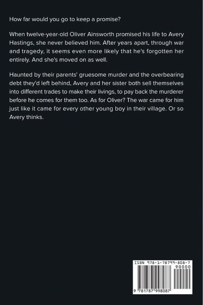 How far would you go to keep a promise? When twelve-year-old Oliver Ainsworth promised his life to Avery Hastings, she never believed him. After years apart, through war and tragedy, it seems even more likely that he's forgotten her entirely. And she's moved on as well. Haunted by their parents' gruesome murder and the overbearing debt they'd left behind, Avery and her sister both sell themselves into different trades to make their livings, to pay back the murderer before he comes for them too. As for Oliver? The war came for him just like it came for every other young boy in their village. Or so Avery thinks.