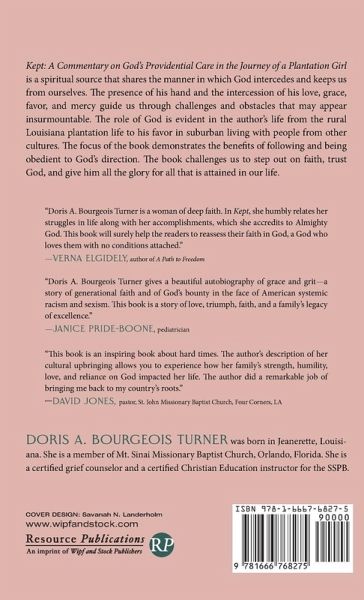 Kept: A Commentary on God's Providential Care in the Journey of a Plantation Girl is a spiritual source that shares the manner in which God intercedes and keeps us from ourselves. The presence of his hand and the intercession of his love, grace, favor, and mercy guide us through challenges and obstacles that may appear insurmountable. The role of God is evident in the author's life from the rural Louisiana plantation life to his favor in suburban living with people from other cultures. The focus of the book demonstrates the benefits of following and being obedient to God's direction. The book challenges us to step out on faith, trust God, and give him all the glory for all that is attained in our life.
