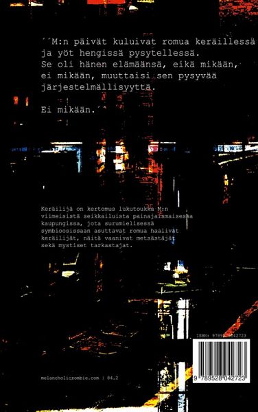 ''M:n päivät kuluivat romua keräillessä ja yöt hengissä pysytellessä. Se oli hänen elämäänsä, eikä mikään, ei mikään, muuttaisi sen pysyvää järjestelmällisyyttä. Ei mikään.'' Keräilijä on kertomus lukutoukka M:n viimeisistä seikkailuista painajaismaisessa kaupungissa, jota surumielisessä symbioosissaan asuttavat romua haalivat keräilijät, näitä vaanivat metsästäjät sekä mystiset tarkastajat.
