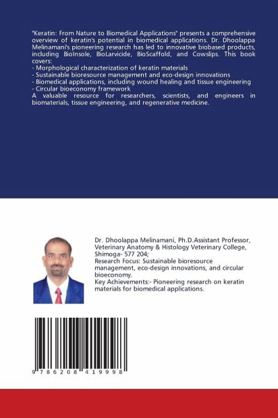 "Keratin: From Nature to Biomedical Applications" presents a comprehensive overview of keratin's potential in biomedical applications. Dr. Dhoolappa Melinamani's pioneering research has led to innovative biobased products, including BioInsole, BioLarvicide, BioScaffold, and Cowslips. This book covers:- Morphological characterization of keratin materials- Sustainable bioresource management and eco-design innovations- Biomedical applications, including wound healing and tissue engineering- Circular bioeconomy frameworkA valuable resource for researchers, scientists, and engineers in biomaterials, tissue engineering, and regenerative medicine.