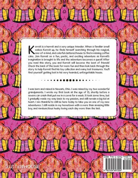 Kermit is a hermit and a very unique traveler. When a familiar smell wakes Kermit up, he finds himself searching through his magical, one-of-a-kind, and colorful cluttered house to find a missing coffee cake. Join Kermit on a fun, poetic, and exciting adventure as Kermit's imagination is brought to life and the adventure becomes a quest! After you read this story, you and Kermit will become the best of friends! Check the back of the book for more fun and then look back through the story to help Kermit find his toy collection and many lost treasures. You'll find yourself getting lost in his very hoarded, unforgettable house.